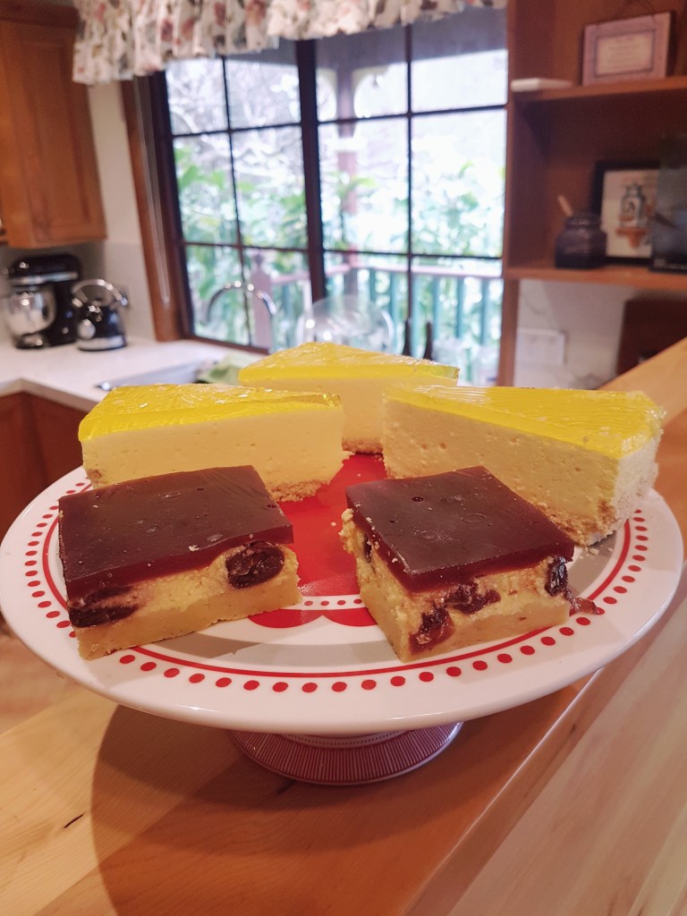 Research results were wrong – once thawed it was a watery, curdly mess. I hate to admit defeat so decided to develop a recipe for a yoghurt slice. There was over a kilo of yoghurt I’d thawed, so it made a large baking dish full, with a filling of that also included ricotta, eggs, lemon and Morello cherries. I made a jelly topping from the cherry juice as an extra layer to complete it and enhance the cherry flavour.