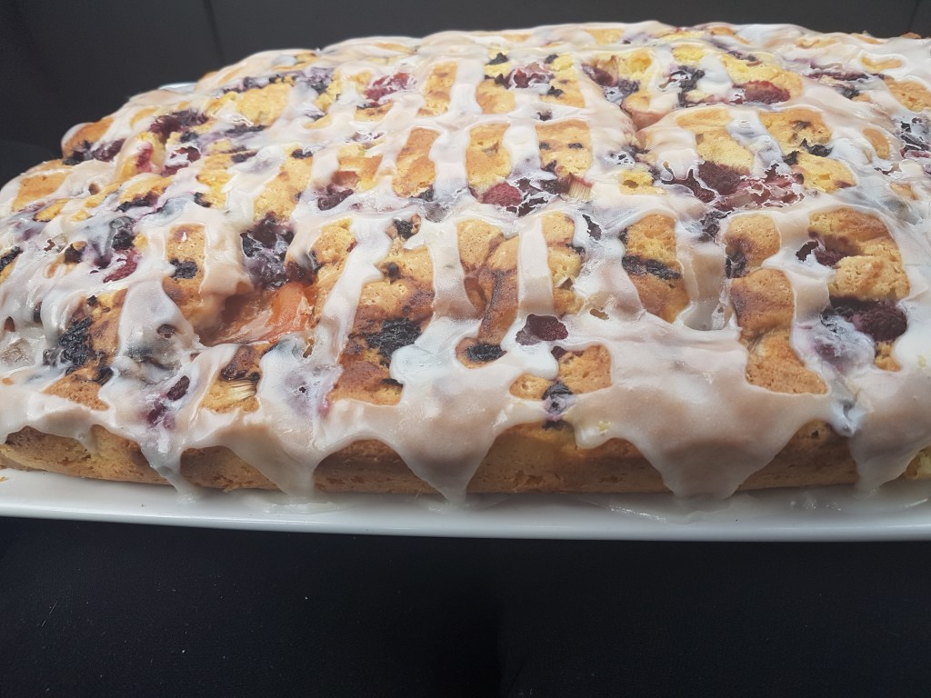 That was yesterday, today another new invention – this tray bake contains in its batter a large stalk of rhubarb (finely diced), and was topped with preserved apricot halves, fresh picked blackcurrants and raspberries.