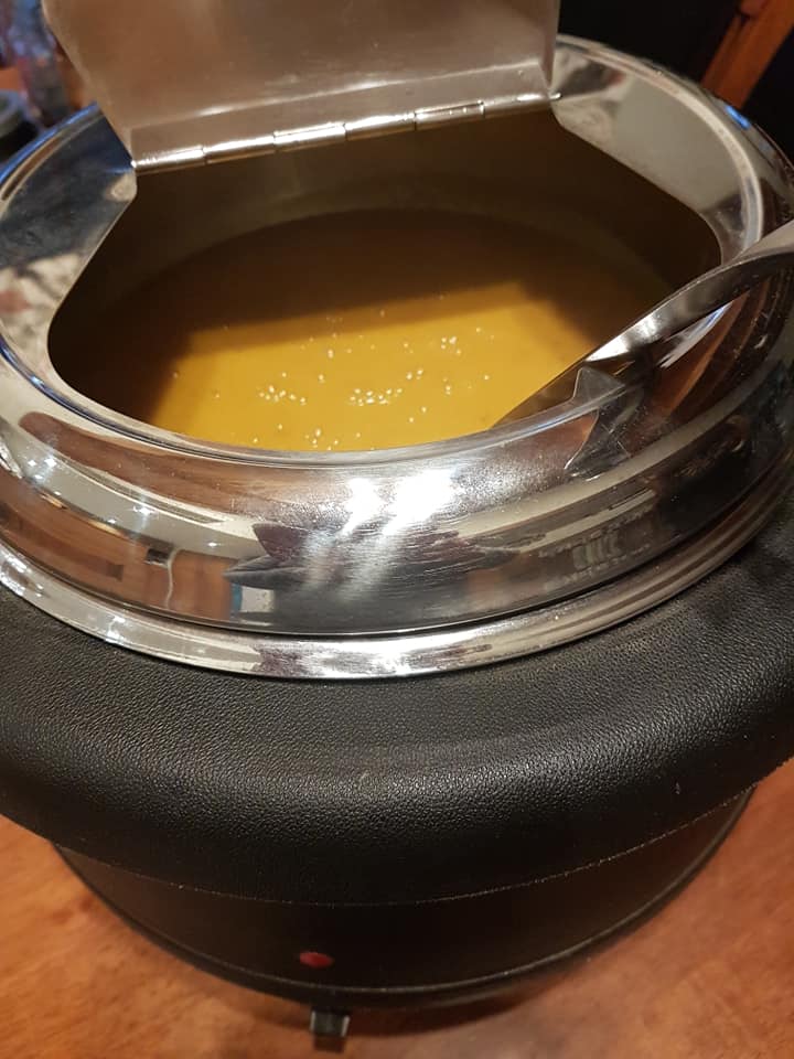(The tureen was filled with 10 litres of spiced pumpkin soup.)