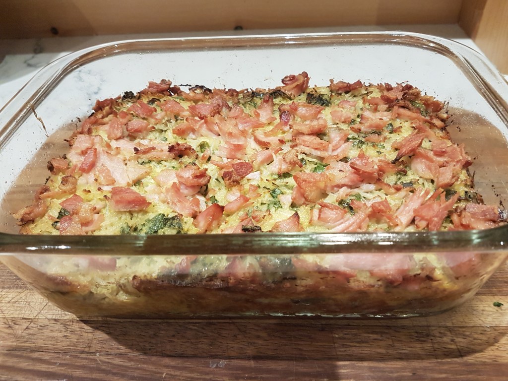 Pour into the casserole dish and top with the chopped bacon, then drizzle over the melted butter, or top with sliced tomatoes sprinkled with salt, pepper and sugar.