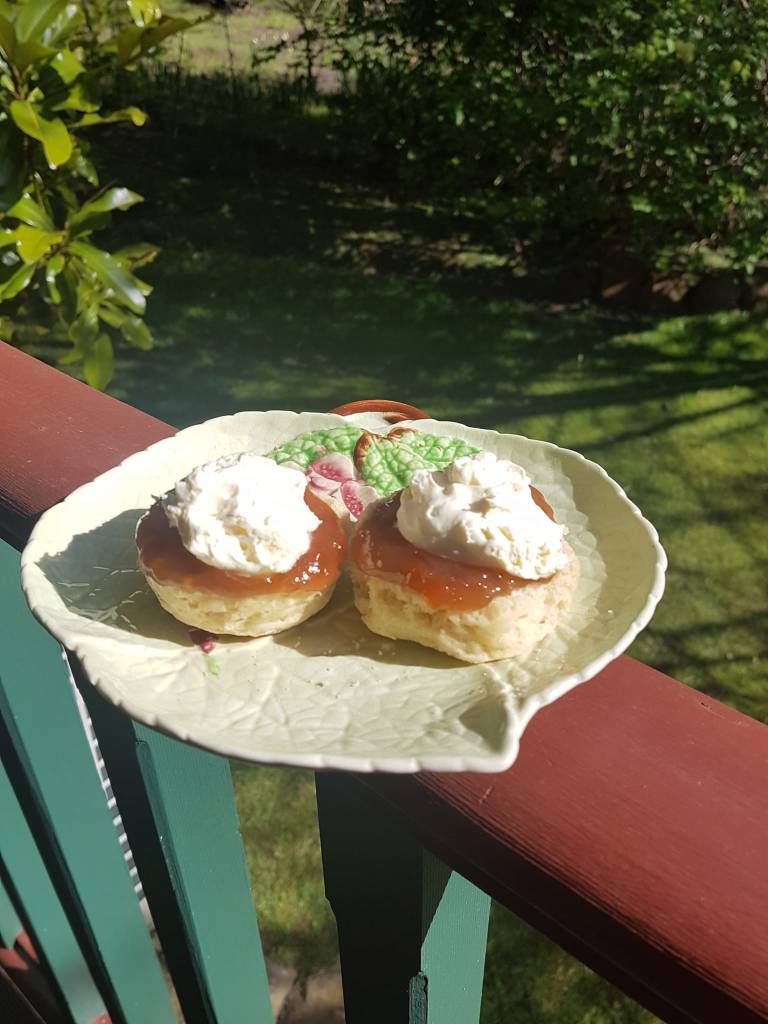 The only thing missing was a batch of scones, so quickly made some. In the photo the cream is slipping sideways a little as the scones were still hot.