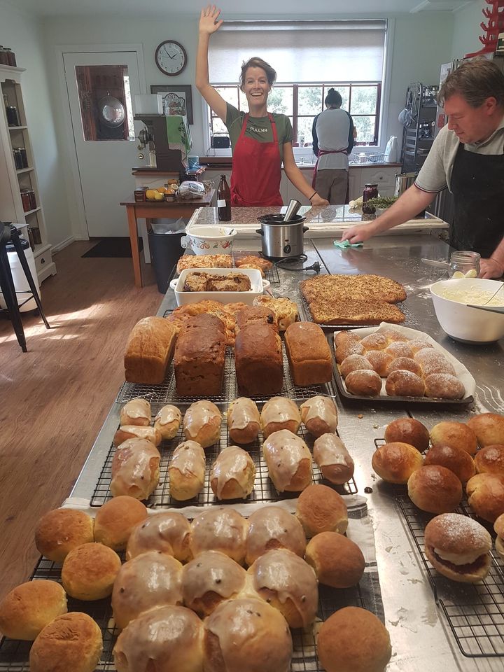 Today though – a bread baking session. From simple everyday bread, to jaffa buns, lemon curd buns, custard buns with passionfruit glaze, cream buns filled with fresh raspberry jam and cream, Turkish breads baked with a filling of spinach and feta, pizza pockets, focaccia, loaves of fruit bread, ham and cheese scrolls, vegemite and cheese scrolls, whole grain bread and more.