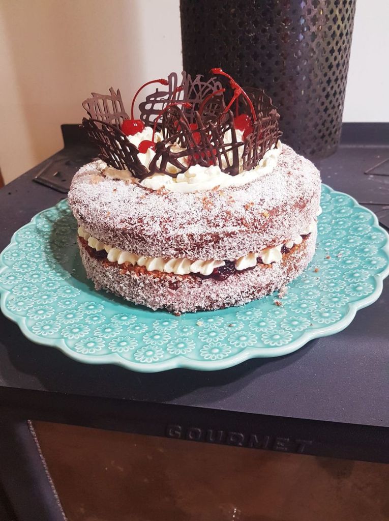 A rather large raspberry lamington cake, filled with jam and cream, topped with yet more whipped cream, maraschino cherries and chocolate decorations (maybe the chocolate was goingg a little too far).