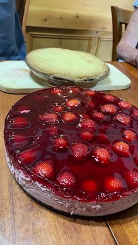 In the first photo – a raspberry and strawberry mousse cake and in the background, an apricot pie.