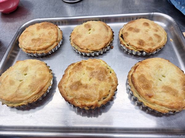 We started out clean and tidy, but soon a mess covered the benches. Not a mess, a creative environment. Added to that a few little edibles – apricot tray bake and a dozen or more rustic beef curry and pea puree pies to keep the energy levels up