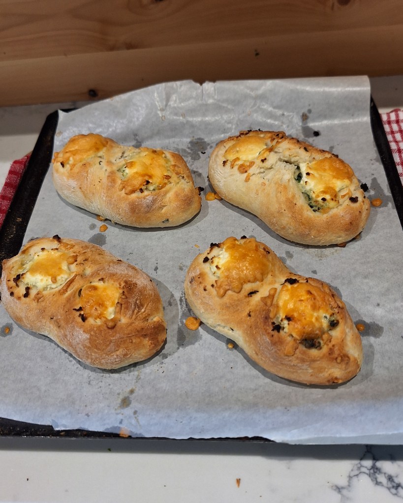 Cheesy and oozy, they are even more than half healthy, filled as they are with fresh picked spinach, ricotta, spring onion, parsley and Parmesan.