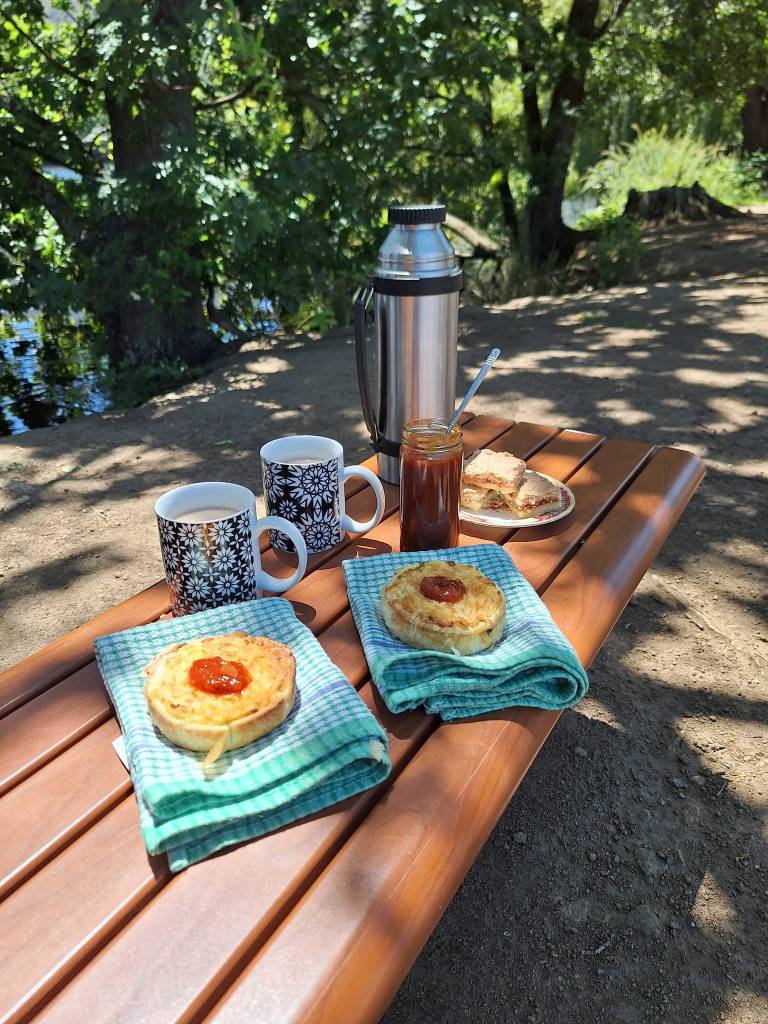 (Lunch by the way, was simple fare – homemade beef curry and potato pies with tomato relish, apricot coconut shortcake and mugs of strong tea).