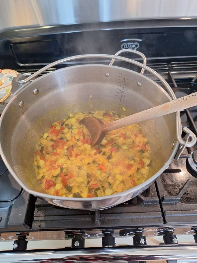 Next (today) – zucchini time. Three batches of zucchini relish, and a large panful of sauteed, the latter to be used in many savoury dishes. Interestingly the yellow zucchinis, a gift from another friend’s garden, had a firmer texture, which is very nice when cooked.