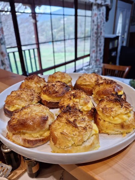 This morning I made, now the chooks are laying again, a rich egg custard for the centre of each bun. It made them all the more delicious I have to say.