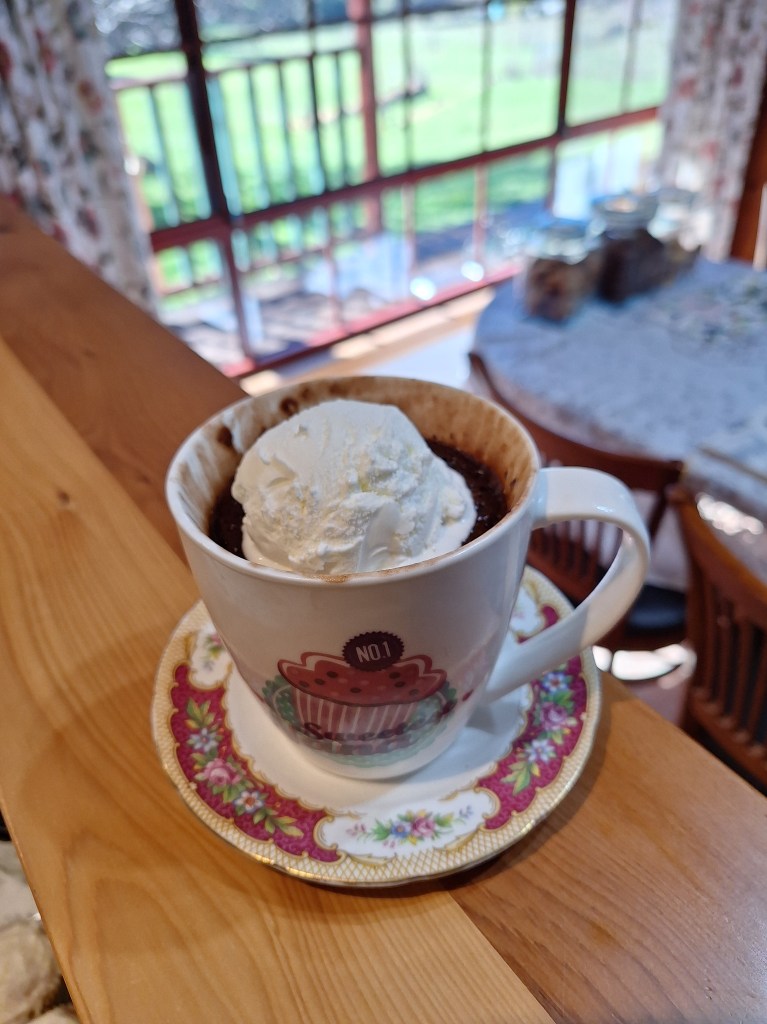 This recipe is by special request – a quickly prepared treat of a self saucing chocolate pudding in a mug, cooked in the microwave.