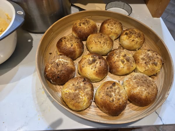 Once glazed with egg yolk, a little pre cooked crumble mixture was sprinkled on top of each bun.
