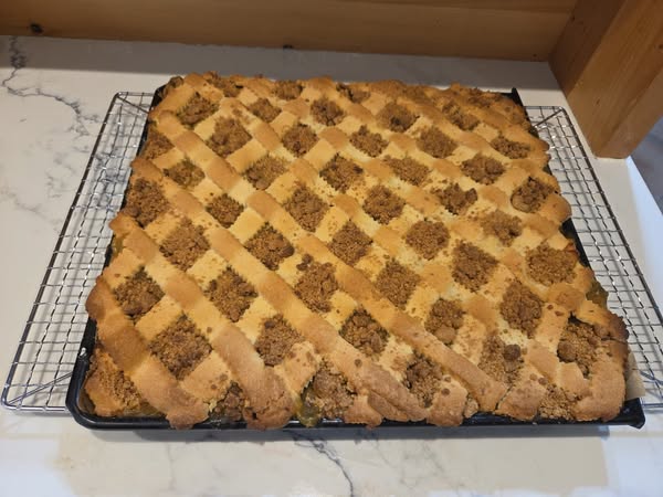 Never mind. I made some sweet shortcrust pastry and threw together a very large apple and sultana slice. The dregs of the crumble mixture filled in gaps in the lattice topping.