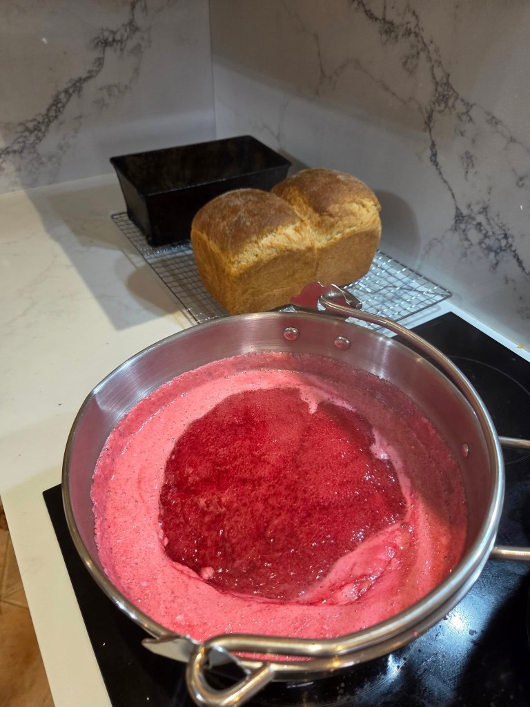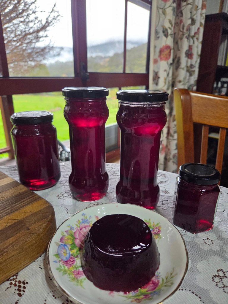 The juice I’d reserved was made into jars of a slightly tart plum jelly, perfect to use in cakes, biscuits like jam drops or on scones with cream.