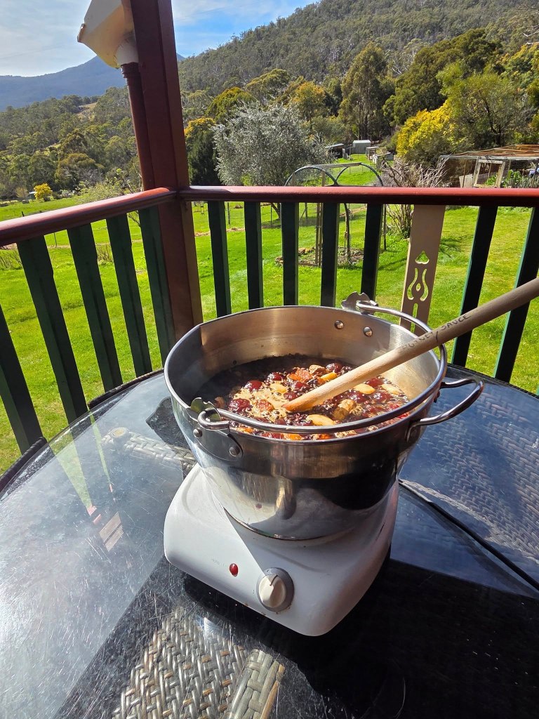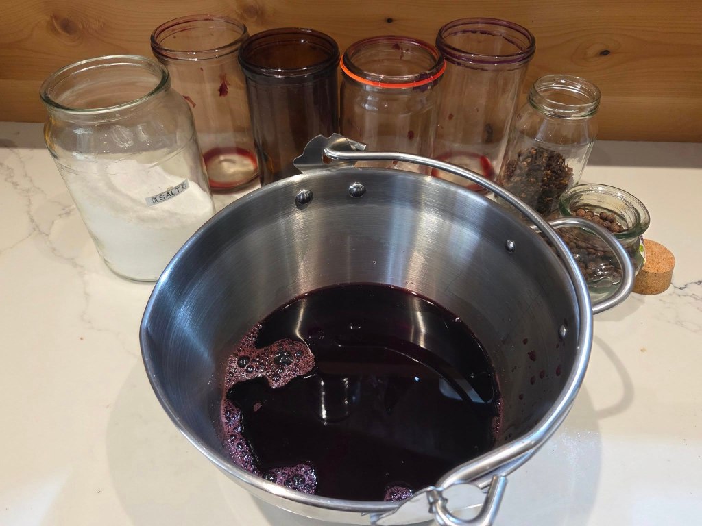 Best cooked outside on such a lovely day, the aroma is intense and tends to leave the house smelling like a pot of pickles for several days or more if cooked indoors.