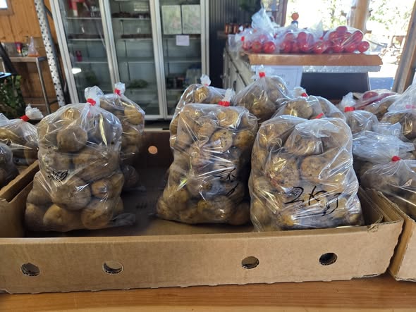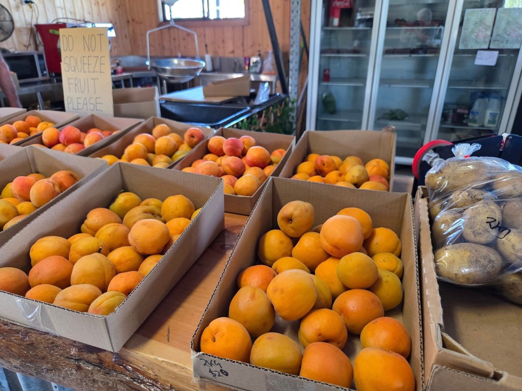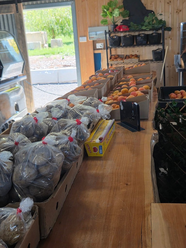 At the end of a long driveway lined with flourishing apricot trees, raspberry canes and more we found such an abundance of apricots, raspberries, beetroot, beans, strawberries, potatoes and more on offer.