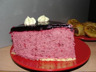 To make the topping, place the raspberry/cherry juice mixture in a saucepan and bring to the boil. Sweeten to taste. Sprinkle the extra gelatine over the extra 100ml cold water and wait for it to bloom, then mix into the hot juice. Cool completely, then pour over the set filling. Return the mousse cake to the fridge until the topping is set before serving.