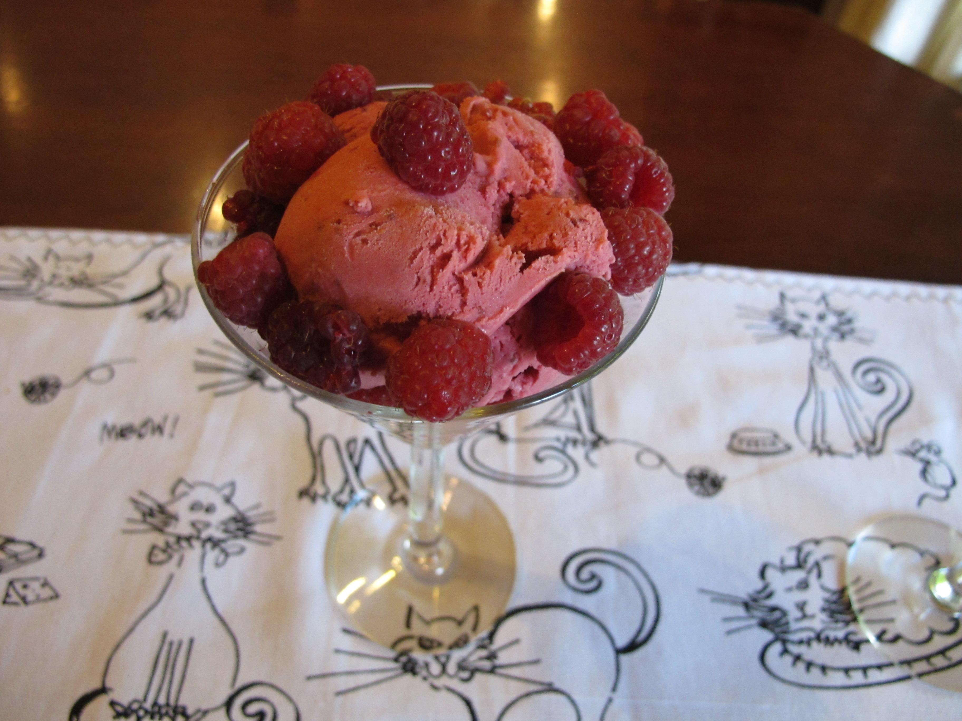 Son, Elliott is following the Paleo diet and suggested that I might like to put together some suitable recipes. So here are my instructions for a Raspberry “Ice Cream” with just three ingredients. I was a bit doubtful about it, but its flavour is divine!